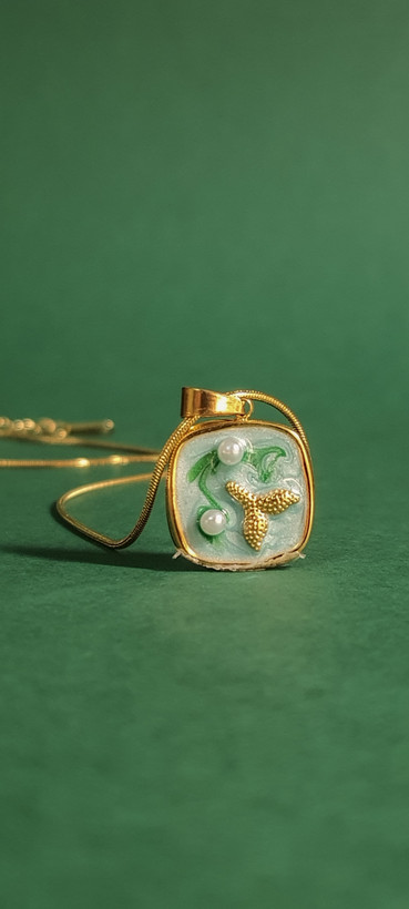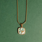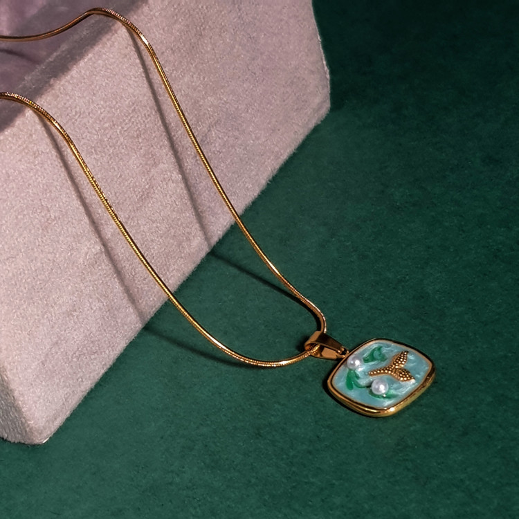 این گردنبند ظریف و منحصربهفرد، تداعیگر زیبایی و اسرار اعماق اقیانوس است. پلاک مربع شکل آن با هنر میناکاری به رنگ آبی فیروزهای صدفی مزین شده و طرح برجسته و طلایی دم ماهی در مرکز آن خودنمایی میکند.