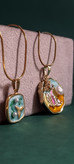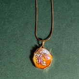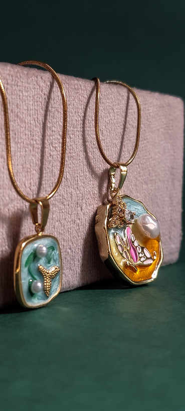 سنگ کوارتز صورتی (یا مشابه): یک قطعه سنگ درخشان صورتی در کنار پلاک، بر جذابیت و انرژی مثبت گردنبند میافزاید. کوارتز صورتی معمولاً نماد عشق و آرامش است.