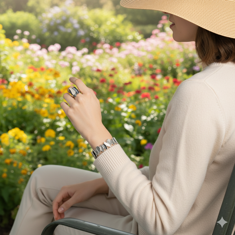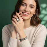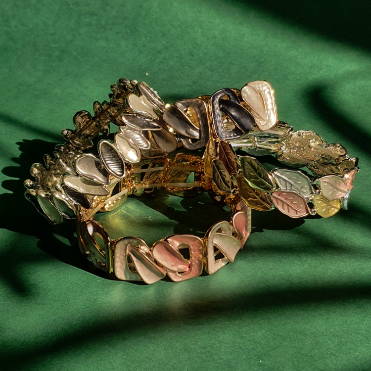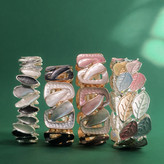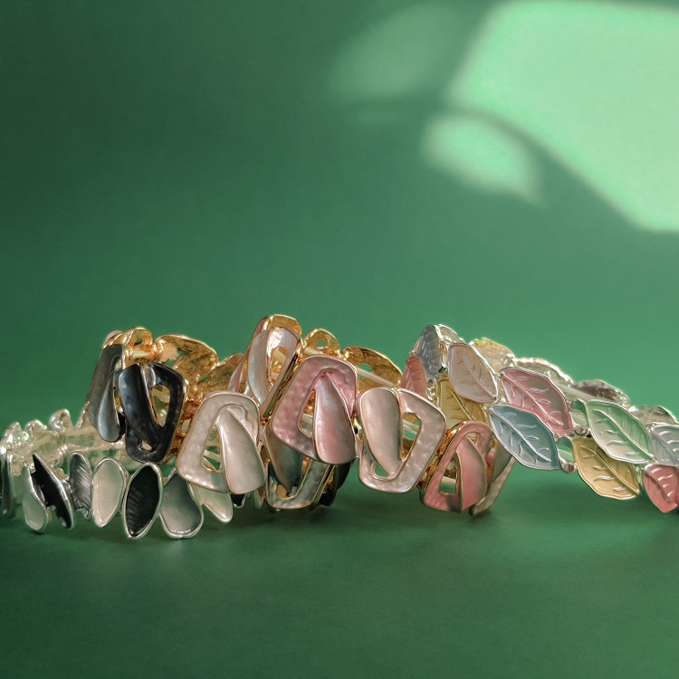 ترکیبی از فرمهای نامنظم و رنگهای خنثی برای کسانی که به دنبال استایلی متفاوت هستند. این دستبند به دلیل داشتن بند کشی، بدون نیاز به قفل، به راحتی در دست قرار میگیرد و برای استفاده روزانه بسیار ایدهآل است.