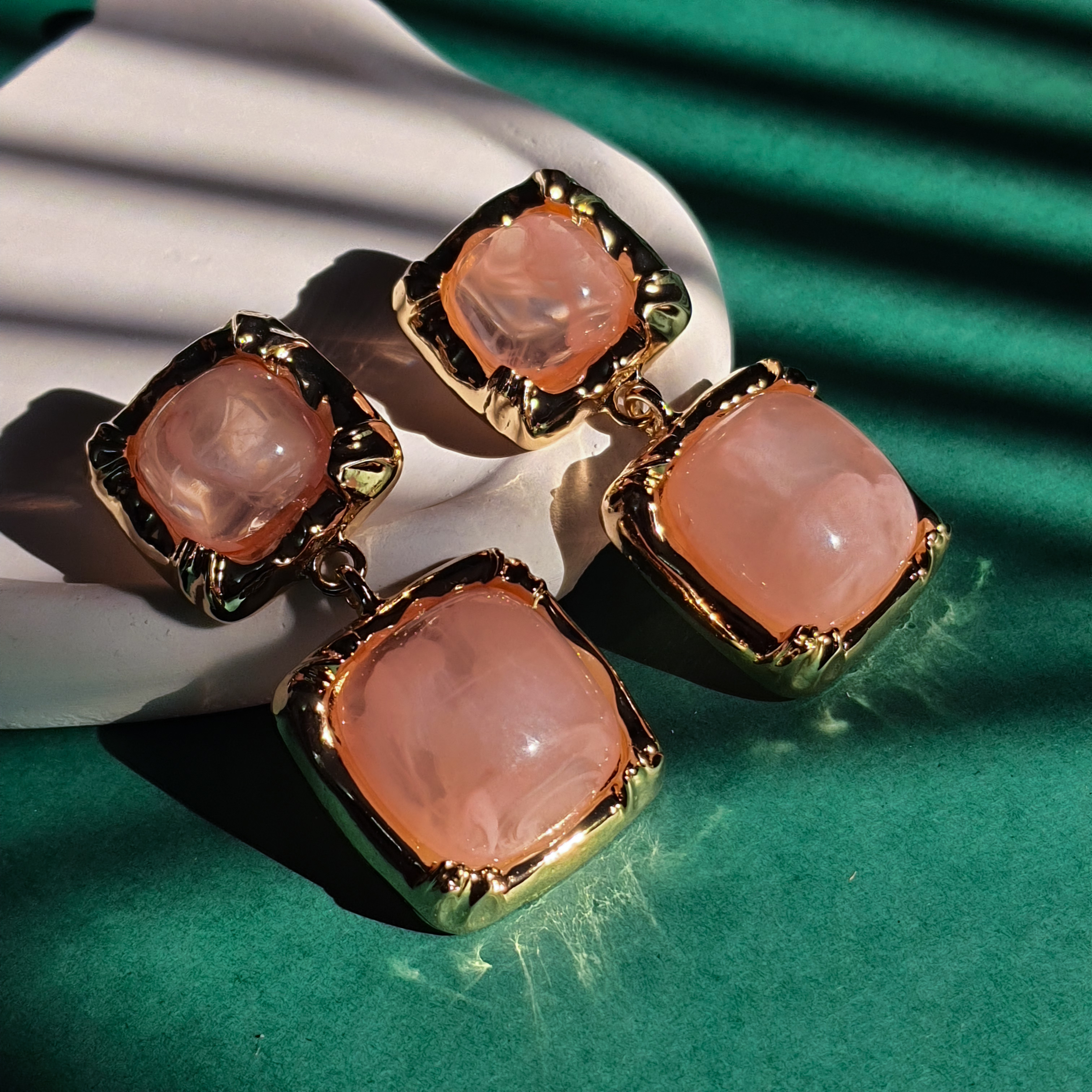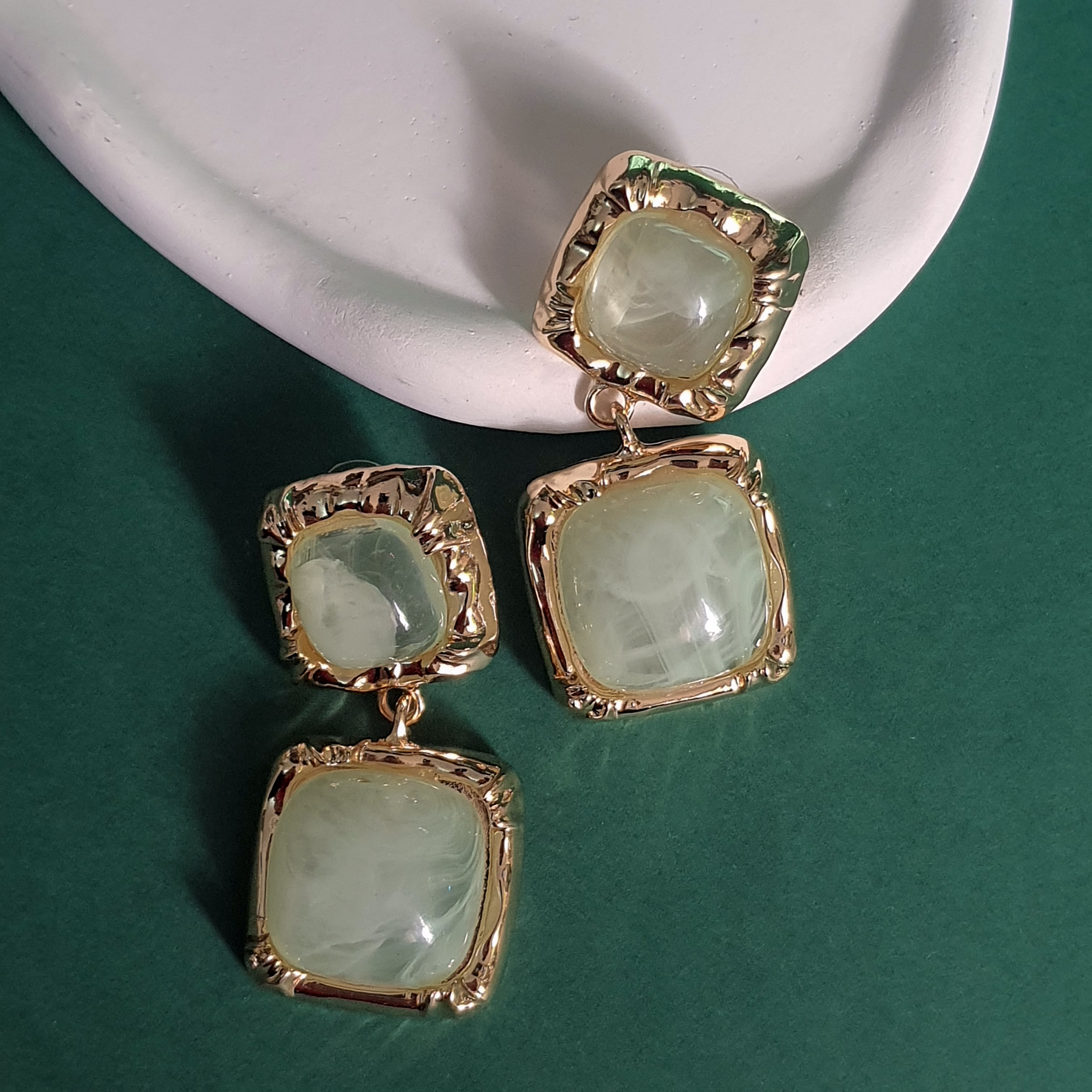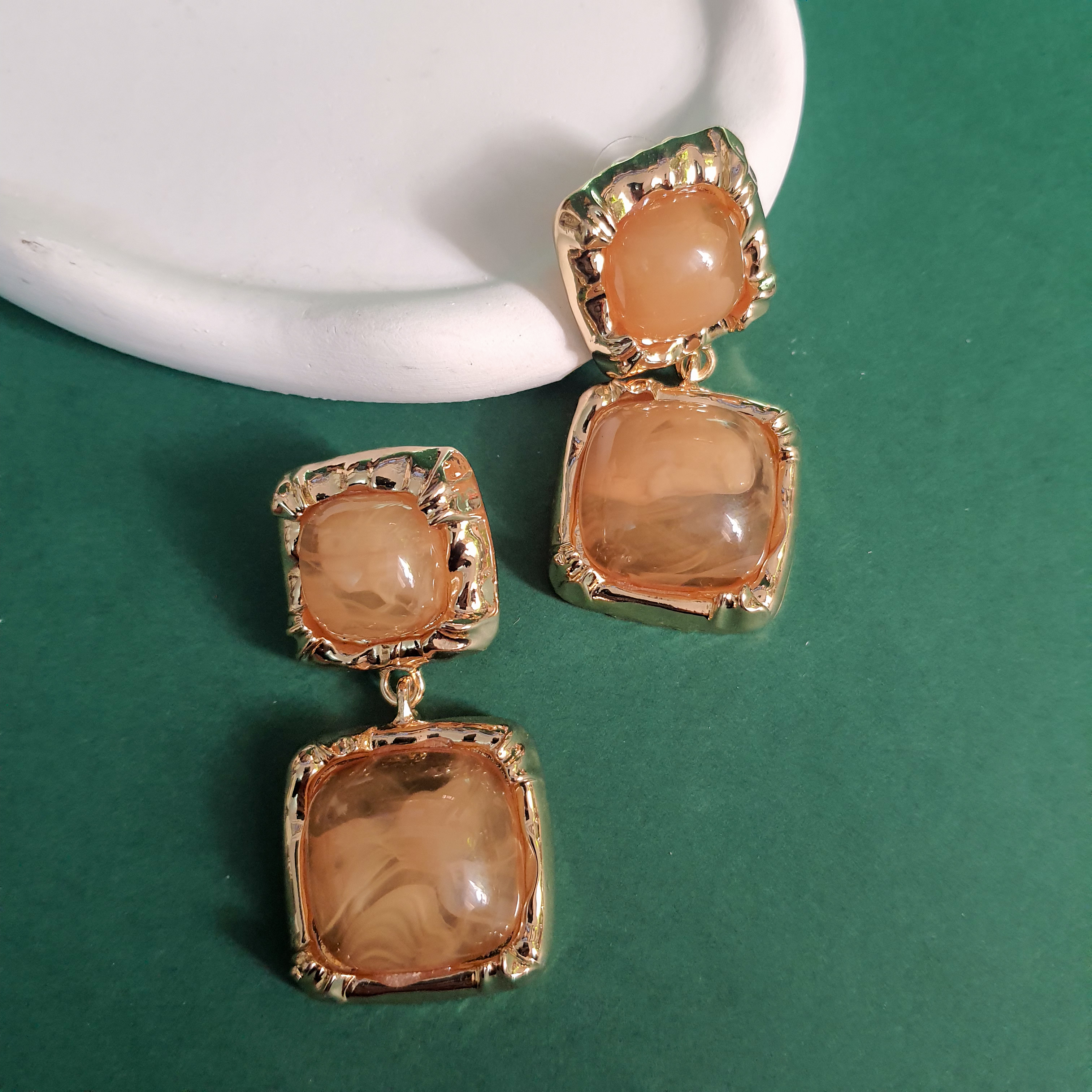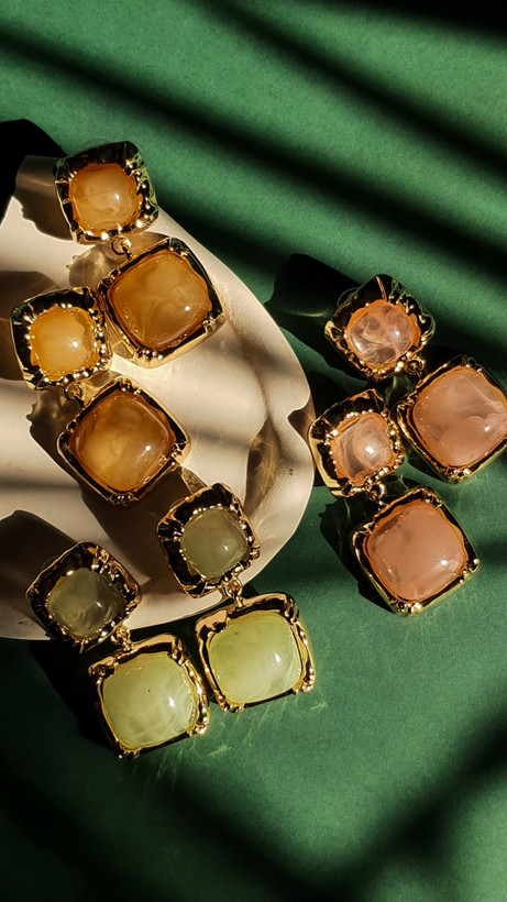گوشوارههای آویز مدل مربعی، ترکیبی بینظیر از جلوهی کلاسیک سنگهای مرمرین و زیبایی مدرن قاب طلایی. این گوشوارهها با طراحی چهار تکهی متصل به هم، حرکتی زیبا و درخشان را هنگام استفاده ایجاد میکنند و انتخابی ایدهآل برای تکمیل استایلهای رسمی و مجلسی هستند. سنگهای رزین با طرح رگههای مرمر عسلی، گرما و عمق خاصی به این محصول بخشیدهاند.