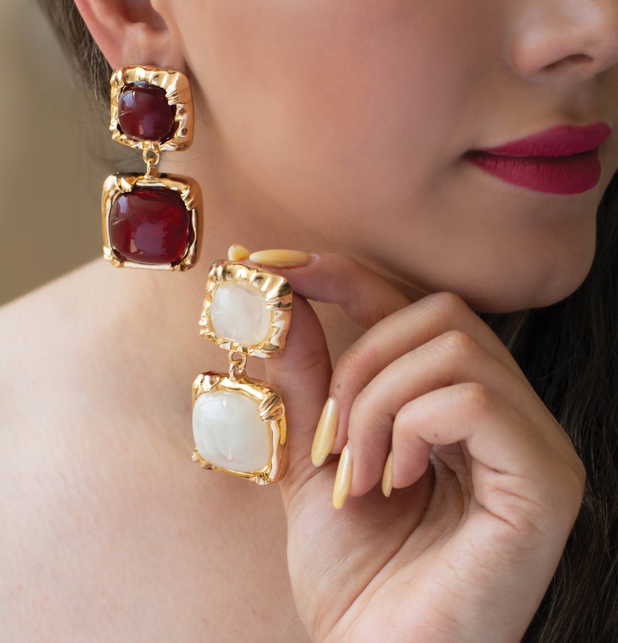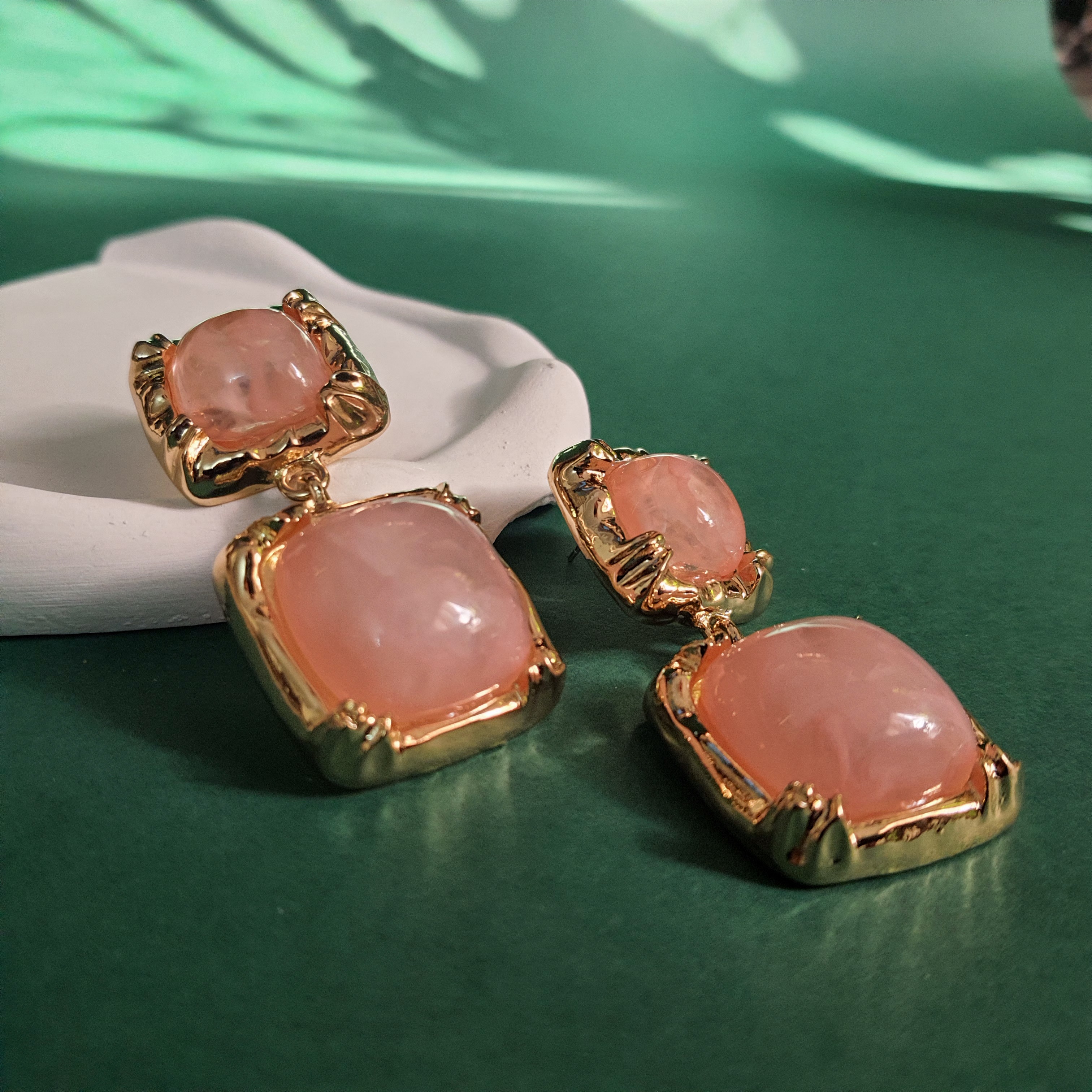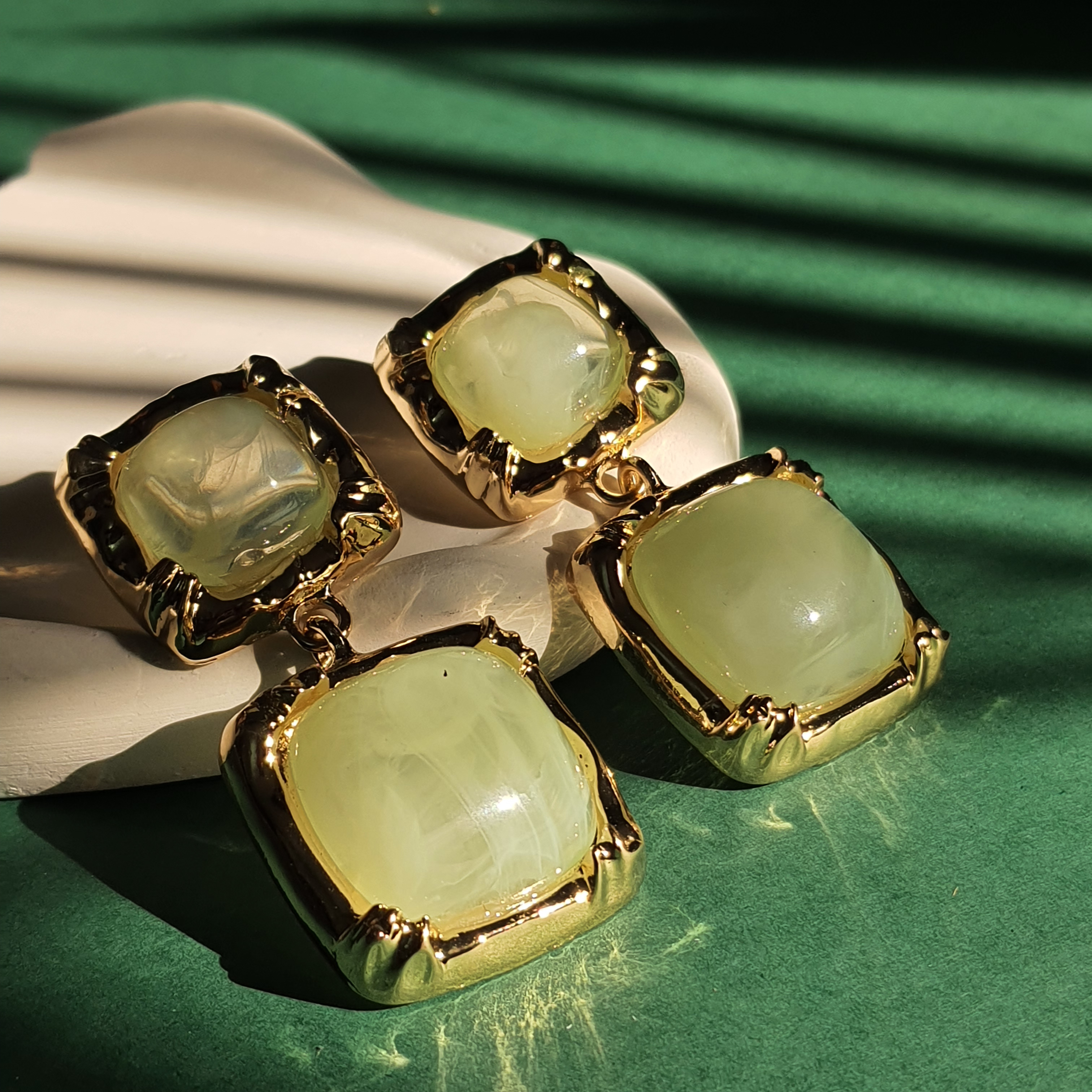 گوشوارههای آویز مدل مربعی، ترکیبی بینظیر از جلوهی کلاسیک سنگهای مرمرین و زیبایی مدرن قاب طلایی. این گوشوارهها با طراحی چهار تکهی متصل به هم، حرکتی زیبا و درخشان را هنگام استفاده ایجاد میکنند و انتخابی ایدهآل برای تکمیل استایلهای رسمی و مجلسی هستند. سنگهای رزین با طرح رگههای مرمر عسلی، گرما و عمق خاصی به این محصول بخشیدهاند.