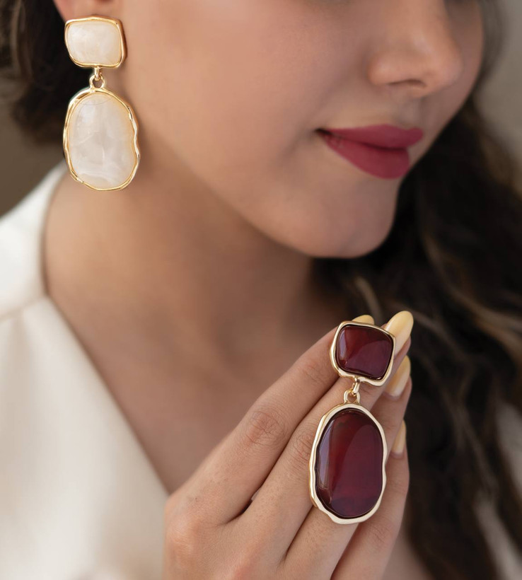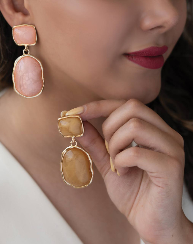 گوشوارههای آویز مدل بیضی، ترکیبی بینظیر از جلوهی کلاسیک سنگهای مرمرین و زیبایی مدرن قاب طلایی. این گوشوارهها با طراحی چهار تکهی متصل به هم، حرکتی زیبا و درخشان را هنگام استفاده ایجاد میکنند و انتخابی ایدهآل برای تکمیل استایلهای رسمی و مجلسی هستند. سنگهای رزین با طرح رگههای مرمر عسلی، گرما و عمق خاصی به این محصول بخشیدهاند.