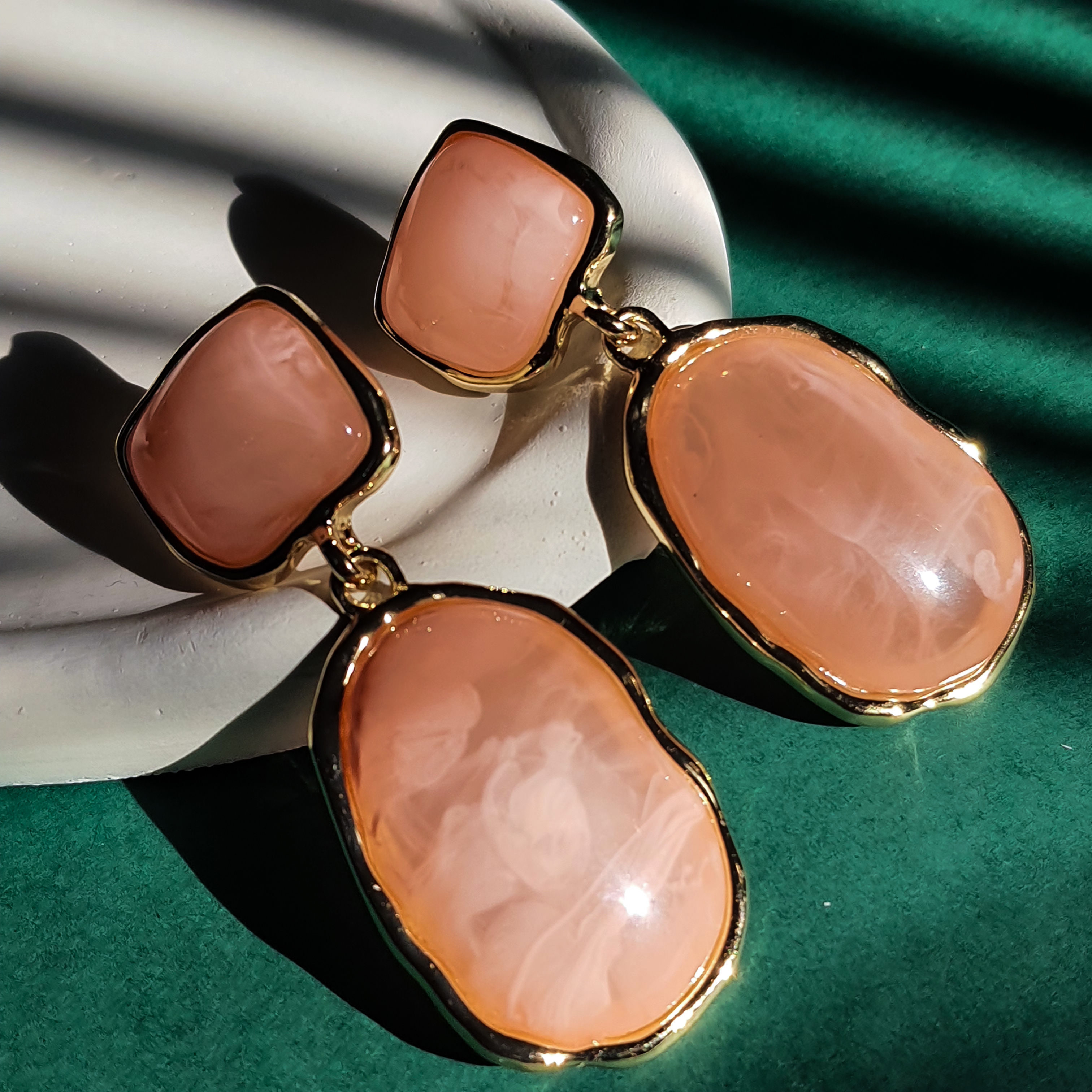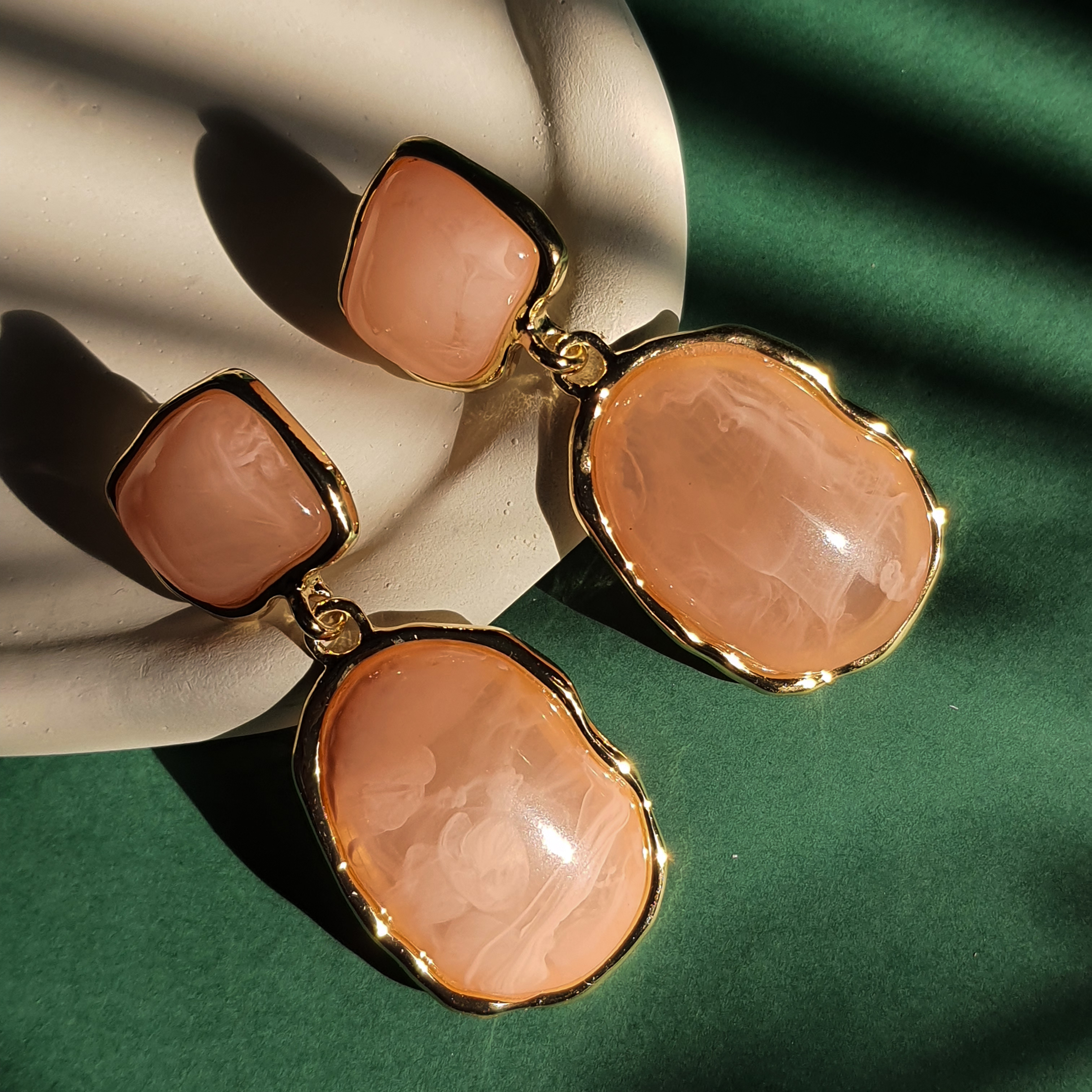 گوشوارههای آویز مدل بیضی، ترکیبی بینظیر از جلوهی کلاسیک سنگهای مرمرین و زیبایی مدرن قاب طلایی. این گوشوارهها با طراحی چهار تکهی متصل به هم، حرکتی زیبا و درخشان را هنگام استفاده ایجاد میکنند و انتخابی ایدهآل برای تکمیل استایلهای رسمی و مجلسی هستند. سنگهای رزین با طرح رگههای مرمر عسلی، گرما و عمق خاصی به این محصول بخشیدهاند.