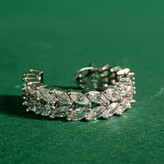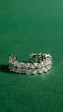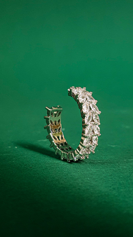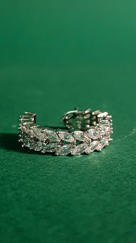 انگشتر «برگ نقرهای» با طراحی ردیفی و الهامگرفته از فرم برگ، از جنس فلز با آبکاری نقرهای ساخته شده و با نگینهای درخشان مارکیز (اشکی کشیده) تزئین شده است.