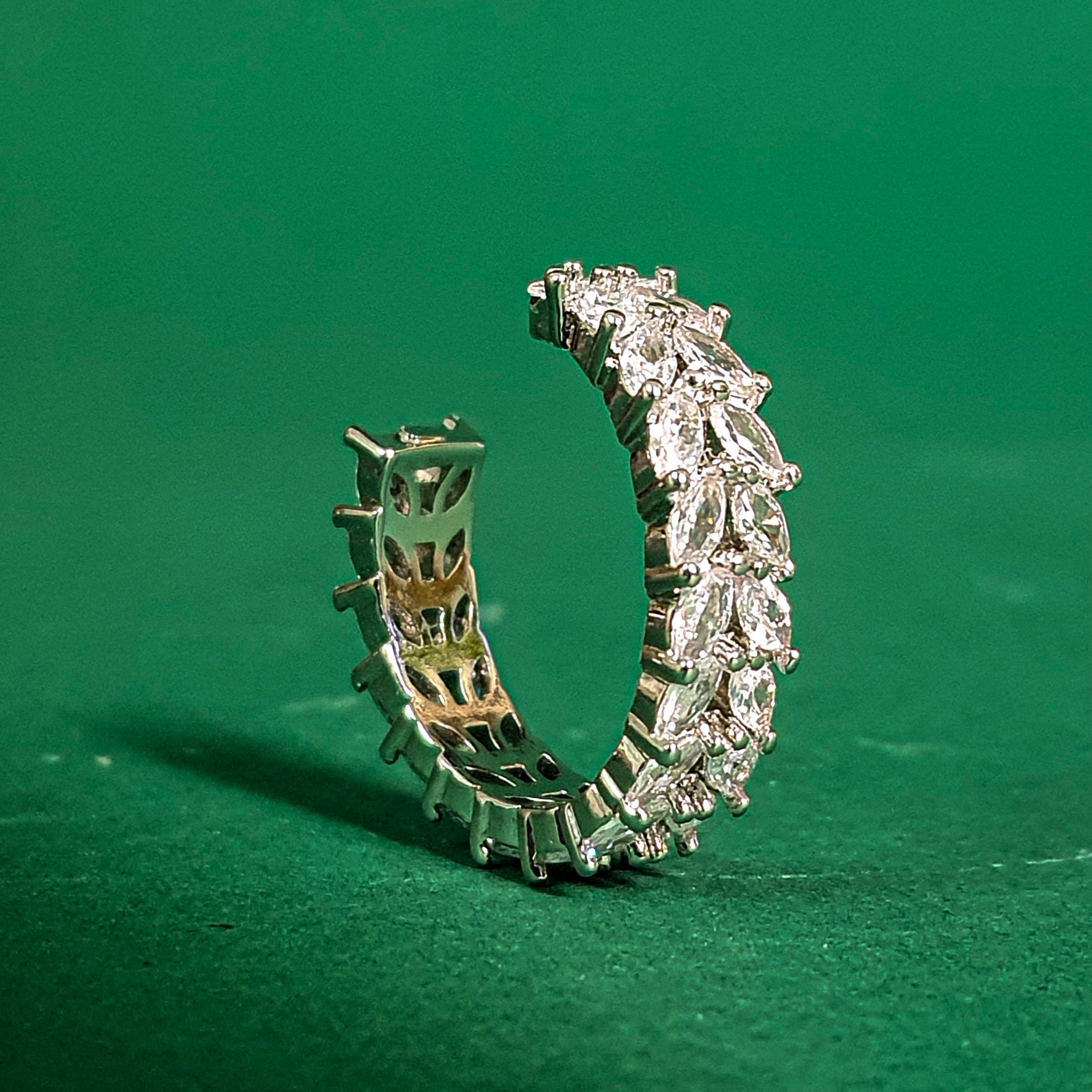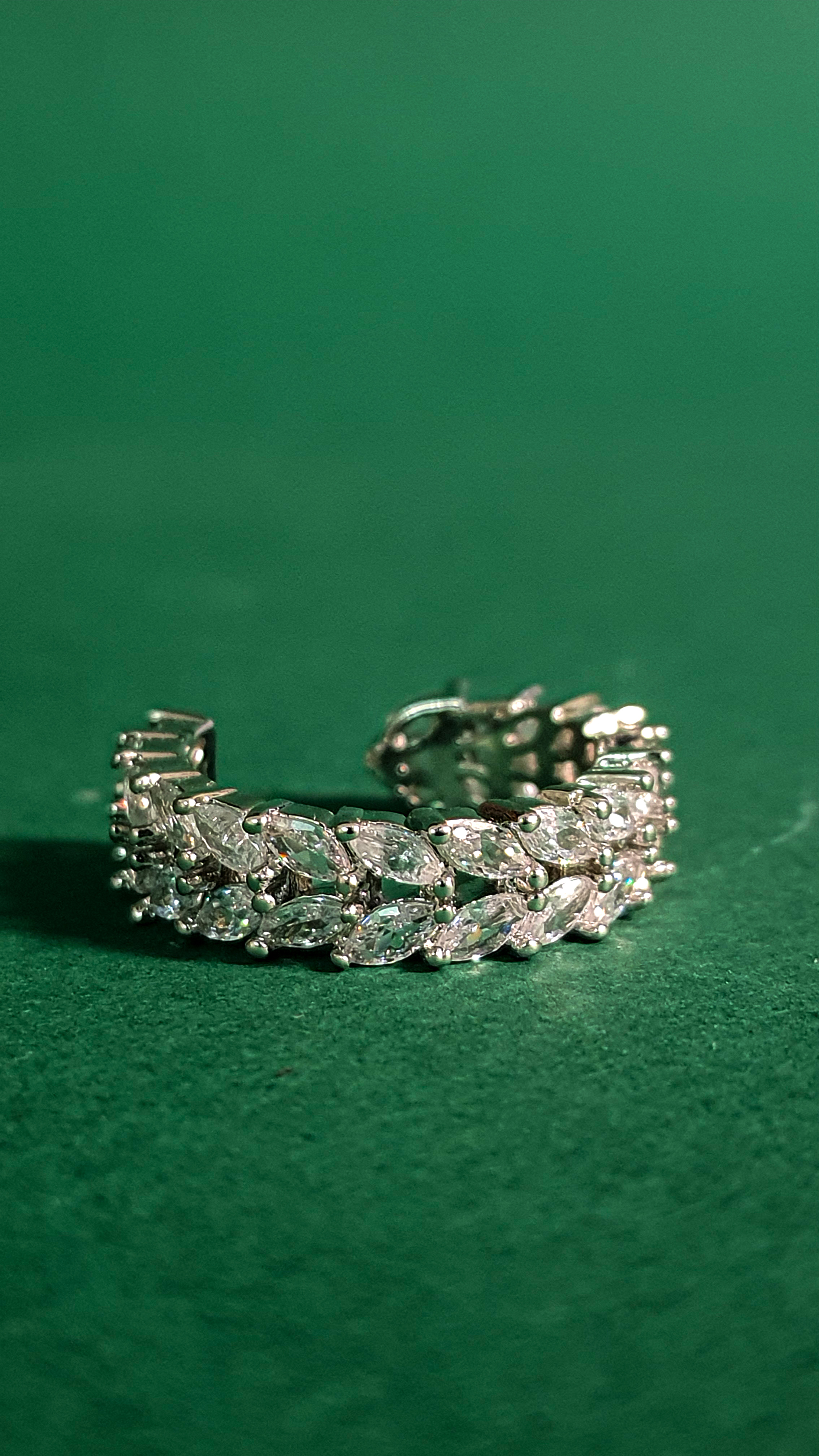 انگشتر «برگ نقرهای» با طراحی ردیفی و الهامگرفته از فرم برگ، از جنس فلز با آبکاری نقرهای ساخته شده و با نگینهای درخشان مارکیز (اشکی کشیده) تزئین شده است.