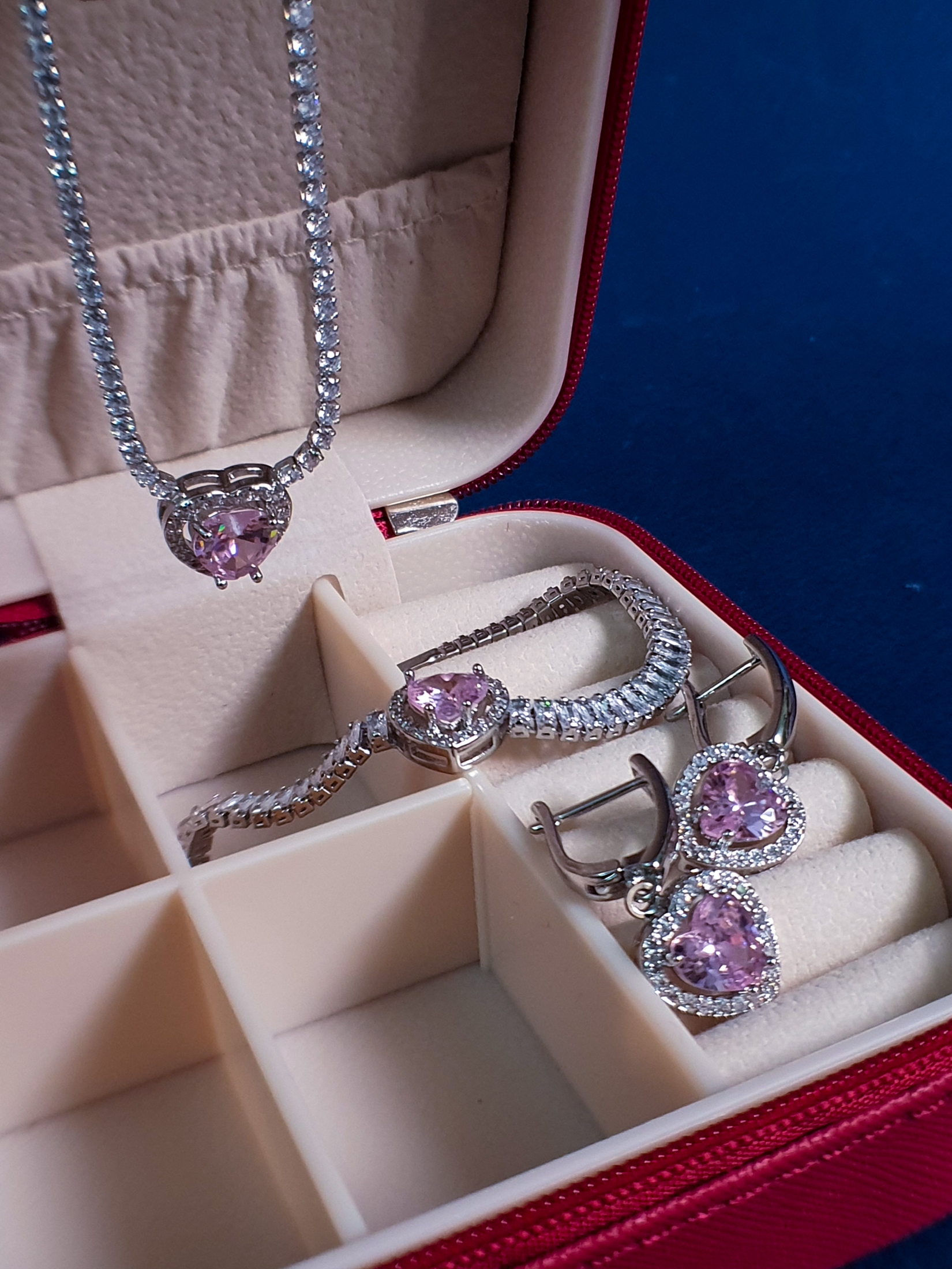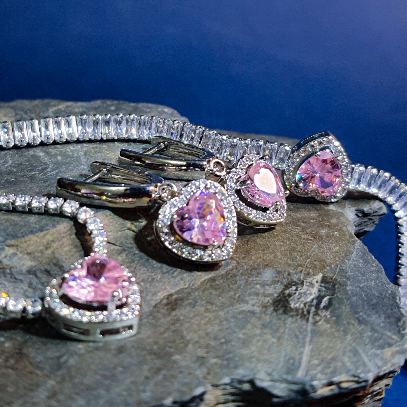 "یه ترکیب رویایی از عشق و درخشش! این ست قلبی با سنگهای صورتی، هم لطافت داره هم شکوه، برای کسایی که میخوان خاص و متفاوت باشن."